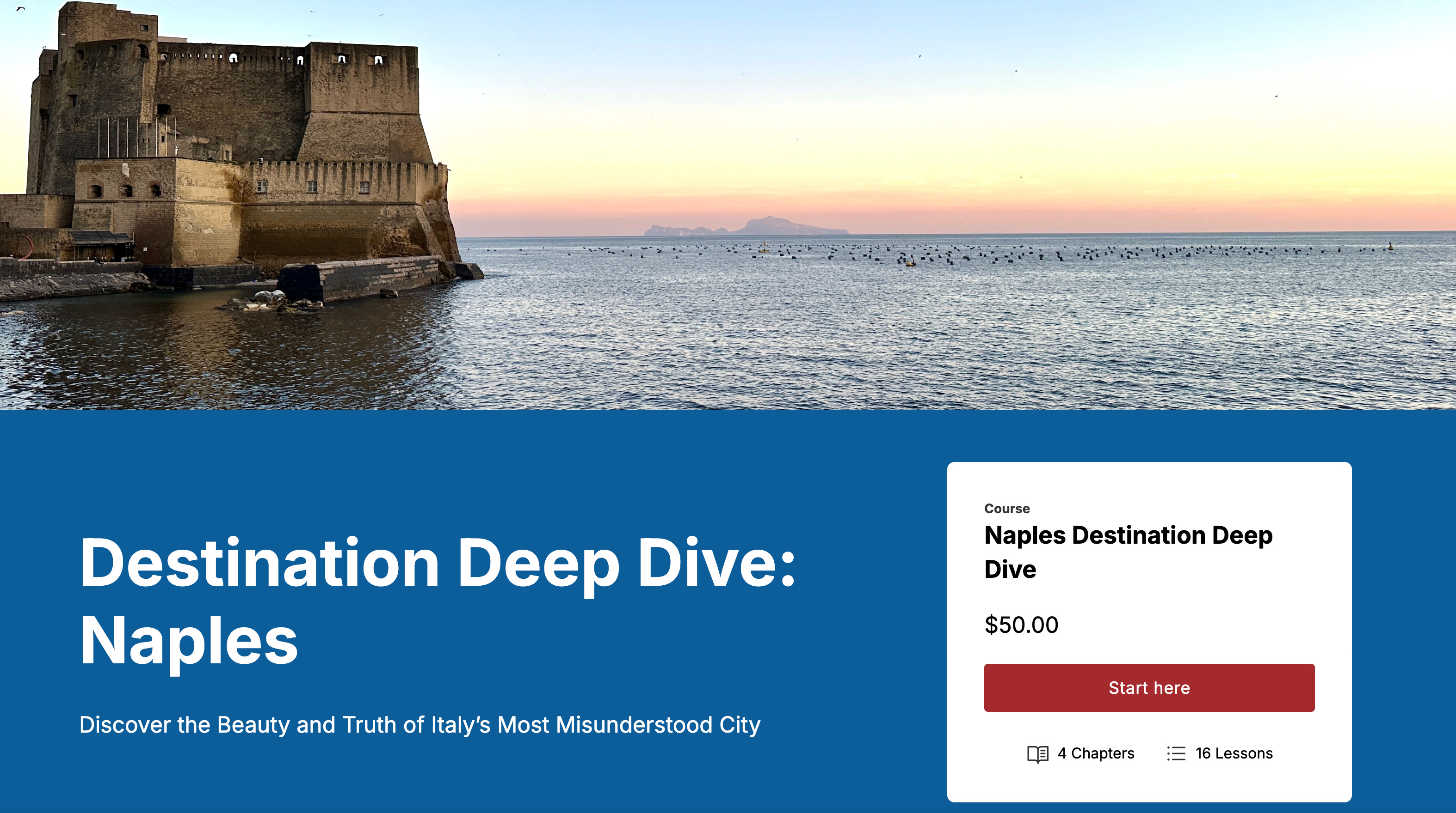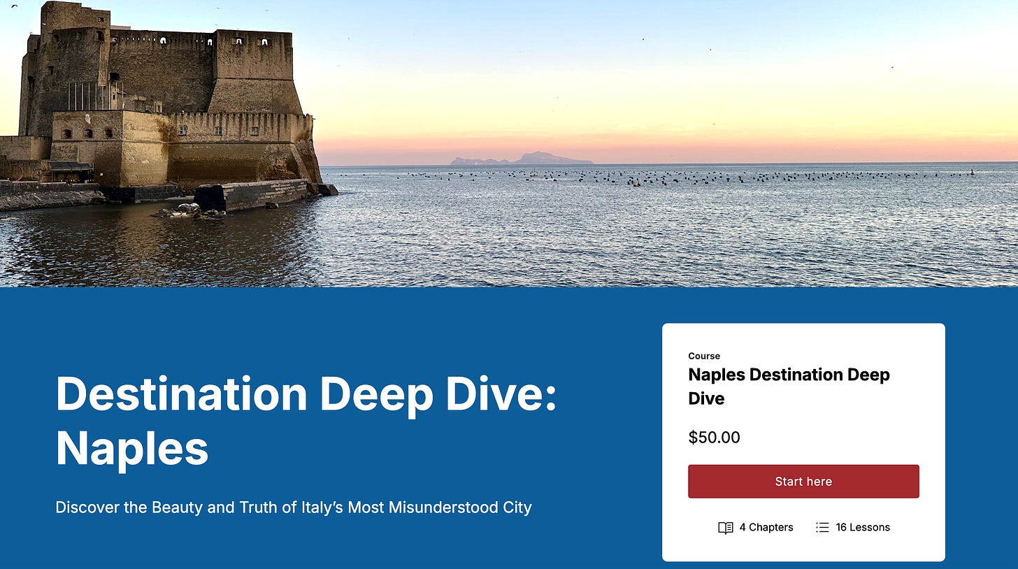 Monthly Destination Deep Dives Subscribers can access the monthly Destination Deep Dive premiere, a live session where I share practical advice and insider knowledge about well-known Italian destinations. After the live presentation, the recording is available for several weeks. After that, the Deep Dive is transformed into a Masterclass-style video series and itinerary, with additional resources available. Paid subscribers receive a 50% discount.