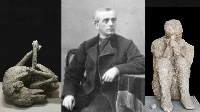 Excavations continued slowly and methodically through the 1860s. The world order was changed by the American Revolution, the French Revolution, and the Neapolitan Revolution. Monarchies were diminished, and modern democracy was born. In 1863, Giuseppe Fiorelli, the man in charge of Pompeii, perfected his technique of pouring the plaster of Paris into the hollow spaces he detected inside the volcanic material. What emerged for the first time were the people who died at Pompeii.
