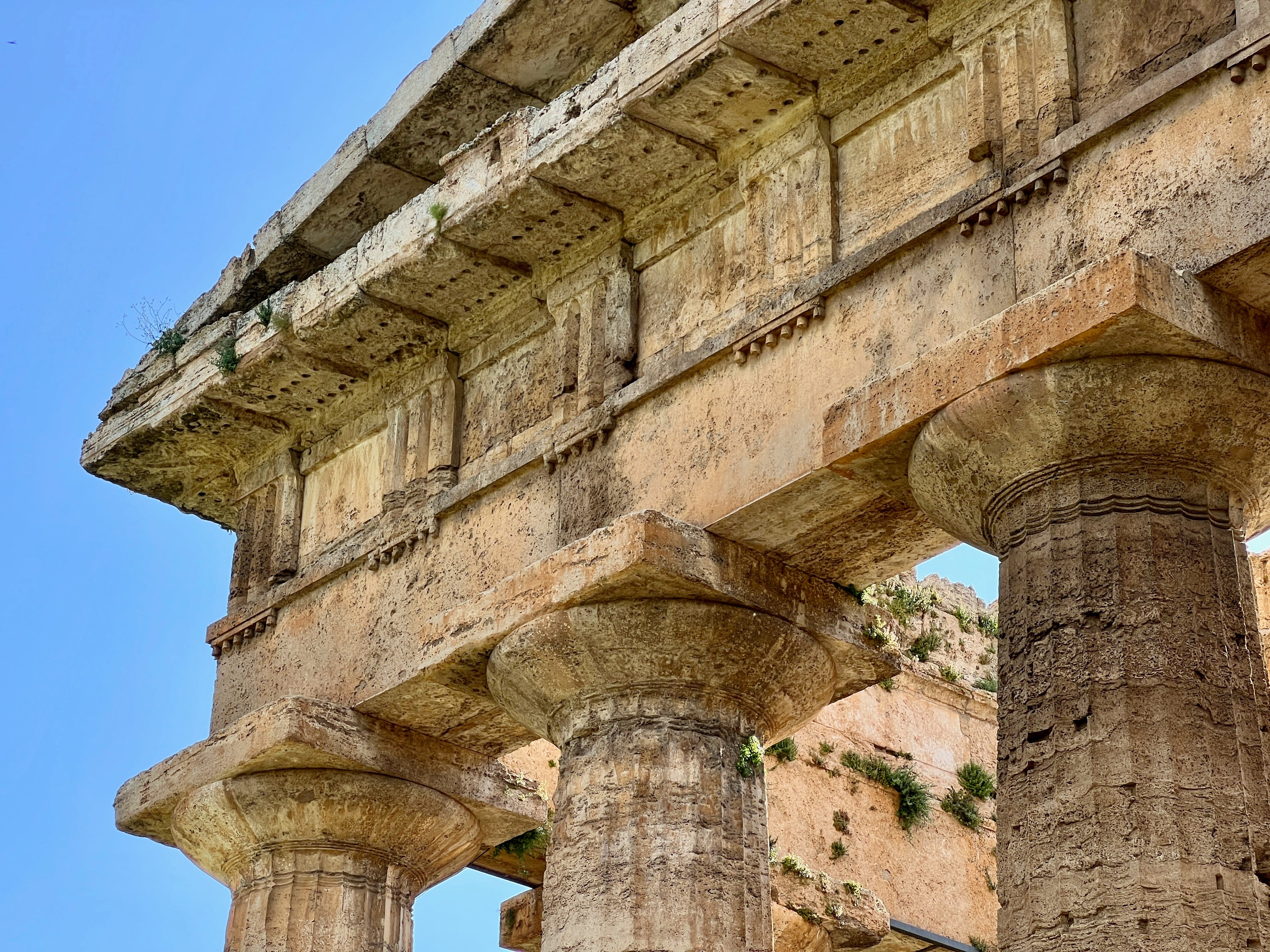 After lunch, walk to the Paestum temples. The swamp was officially drained in the 1930s by the Fascists, another group that sought to legitimize itself by resuscitating Roman ruins, and the ground continues to be managed today. After the war, when malaria was eradicated, a modern Paestum was fully developed. If you walk on the right side of the road, you’ll see water running – there are ancient springs here, which certainly inspired the placement of the temples nearly 3,000 years ago. The presence of the Asclepieion, natural springs, and temples together indicates that the Greek colonists identified this as a place of healing. And you can squint past the sunlight and use your imagination to see a parade of buffalo, pulling a plough with a giant Roman column atop it, en route to Salerno. Because everything good from the old world should be used to build the new one.