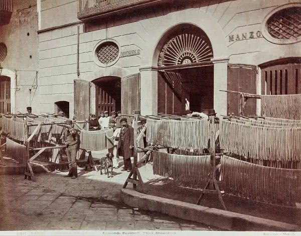 And Torre Annunziata, he recommended trying macaroni, since all the pasta factories are there. He writes: “The principal industry of the town is macaroni making, which may be seen here in great perfection on application at any of the mills. Until recently, it was supposed that macaroni, like wine, could only be made by manual labor. The skill of modern engineers has shown this notion to be fallacious, and macaroni is now almost universally made by machinery and is not at all inferior to that made by the old-fashioned plant. We have, of course, a loss of the picturesque, but we are learning to bear this loss with the serenity acquired by habit.”