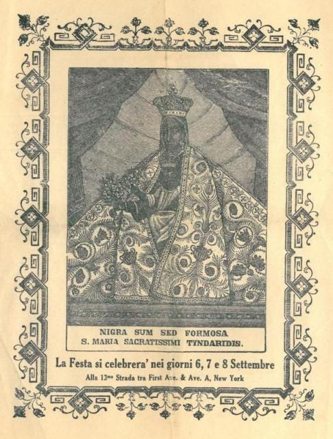 In 1905, emigrants from Tindari in Sicily transported their Black Madonna, whose shrine was built atop a temple of Cybele, to East 13th Street in New York City. In the late 1990s, scholar Dr. Joseph Sciorra studied this community and then discovered the shrine as part of what had become the Phoenix Bar and reinvigorated the festa in a more secular mode of dancing and poetry readings. After a two-year hiatus because of Covid-19, the celebration will resume on September 8, 2022.